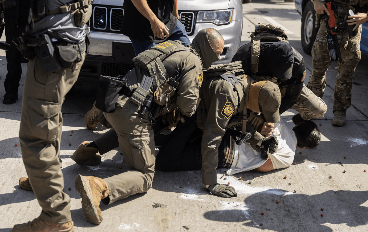 These arrests are getting shockingly violent. It is common for masked agents to smash car windows and body slam people. Protesters are routinely brutalised and even targeted later. In one instance, agents caused a car crash near the site of raids and protests. They let the other driver go but later decided to label him a dangerous activist who impeded their work. A Border Patrol SWAT team used explosives to raid his house and terrorise his family while searching for him. All charges against him were dropped, but the agency used the raid as an opportunity to film a promotional video to threaten protesters. Immigration agents even arrest politicians who question their actions.