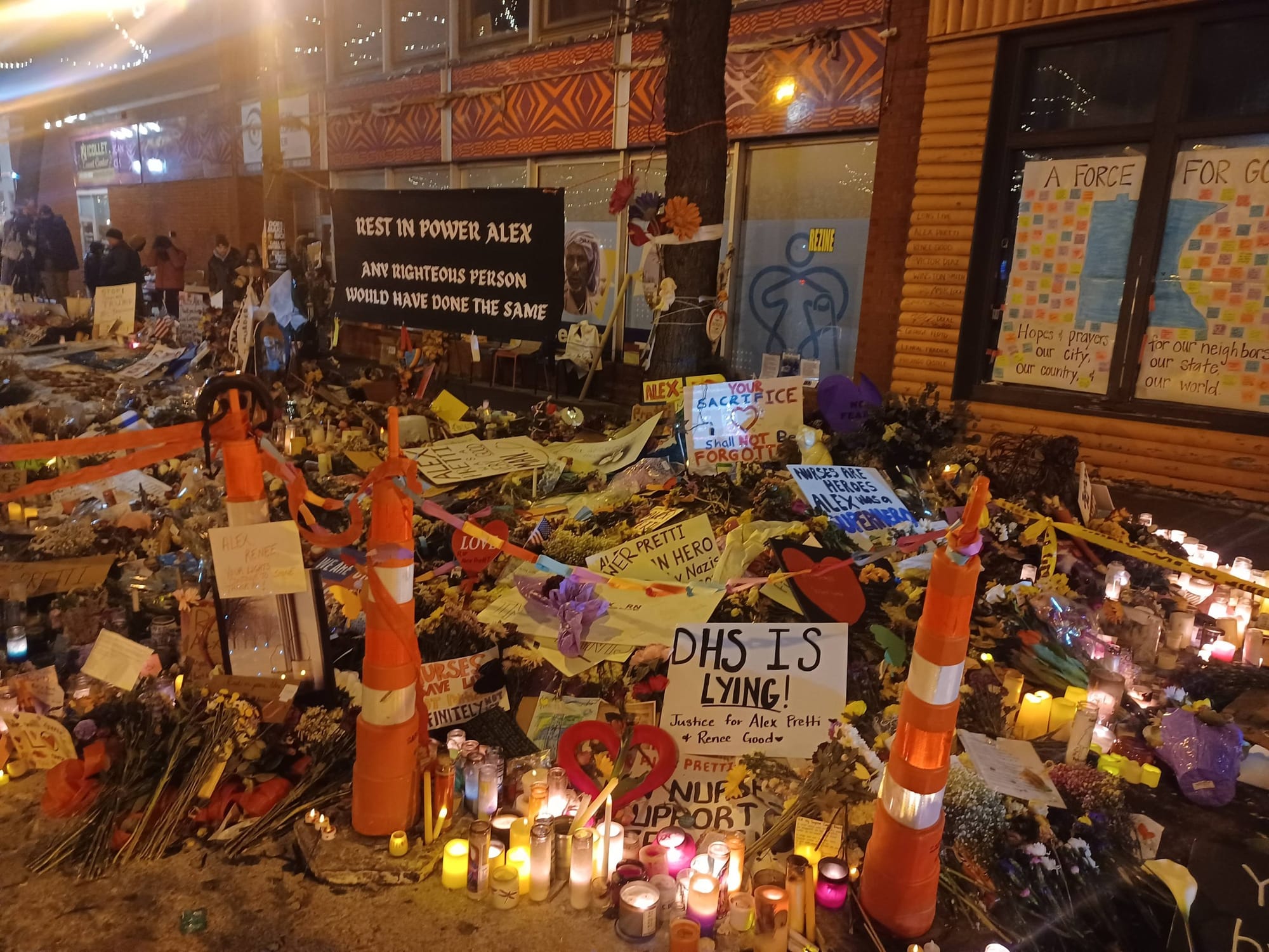 I didn’t realise that Pretti was murdered in a commercial district promoted by the city as a tourism destination. The candlelight memorial dedicated to him was incredibly beautiful and solemn. There was a vigil happening where several people spoke, and we stopped by for a few minutes in the frigid temperatures. It’s worth noting that there are large and small posters of Renee Good and Pretti all over Minneapolis, another sign of how politicised daily life has become.
