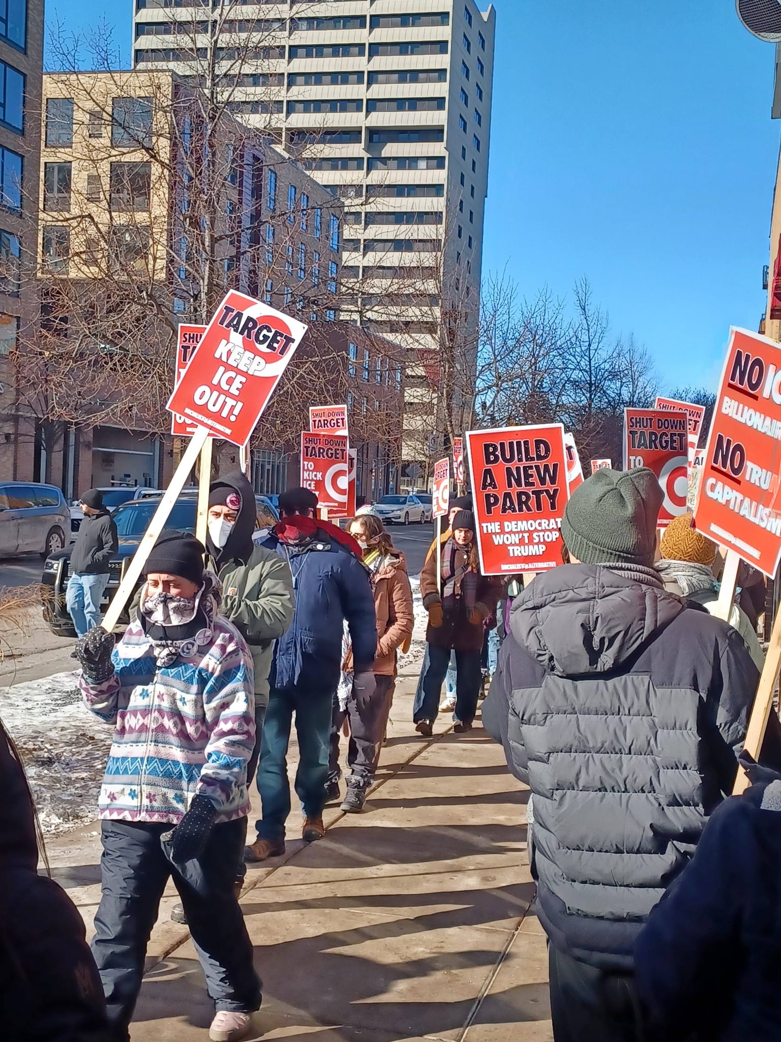 The first Target protest I attended was in the Dinkytown section of Minneapolis, a commercial district where a large number of university and college students live. There I met veteran socialist and union activist Kip Hedges. The picket was about 60 people, a good mix of young and older activists, where Socialist Alternative (a US socialist group not aligned with Socialist Alternative in Australia) played an important and positive role. Many of the younger people there were Socialist Alternative activists and supporters. We protested outside for a while and then entered the store, chanting and protesting with signs and a bullhorn. The Target store had a hands-off policy—we pretty much did what we wanted and left the store after about fifteen minutes, and continued to picket outside.