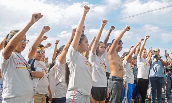 We are uniting, and we are standing up, and we’re saying, ‘No more!’Against these powerful interests are ordinary workers, farmers and environmental activists spearheaded by indigenous peoples (Native Americans in the US and First Nations in Canada). The resistance took a major step forward when the Standing Rock Sioux Tribe set up an ongoing protest camp near the Missouri River, called Sacred Stone, while snow was still on the ground in April. Any future oil leak would threaten their drinking water, and the construction process would destroy sacred burial grounds.