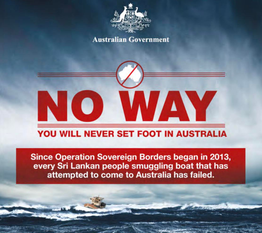 The poster was glued to a wall or a column—I can’t quite remember—at Vavuniya train station in northern Sri Lanka. At the top, an outline of Australia crossed like a no-smoking sign. A small fishing vessel was pictured on perilous seas below it. Bold font was used for the type in the middle. Though the elements had drained the paper of its original hues and mellowed the once dramatic contrasts, the message was still clear, even if most people in the area couldn’t read English. It was 2017. The Australian government had begun producing the posters a few years earlier for Operation Sovereign Borders, its militarised effort to prevent refugees claiming asylum.