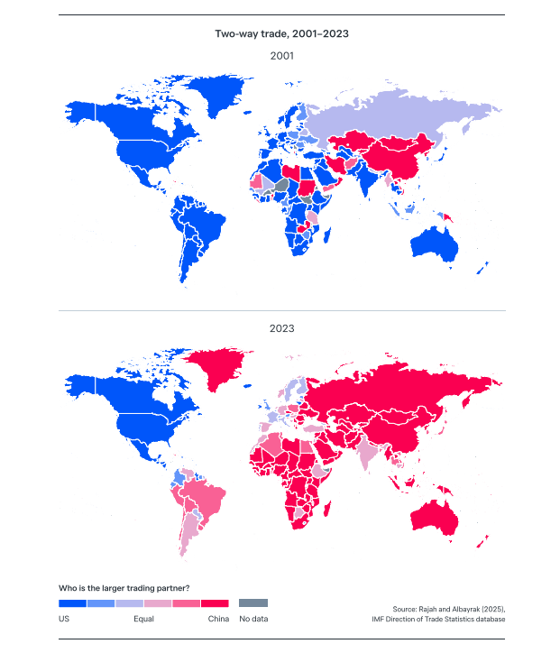 China’s lead over the United States in international trade relationships has only widened since the last US–China trade war of 2018–19. Around 70 percent of economies trade more with China than they do with America, and more than half of all economies now trade twice as much with China compared to the United States.