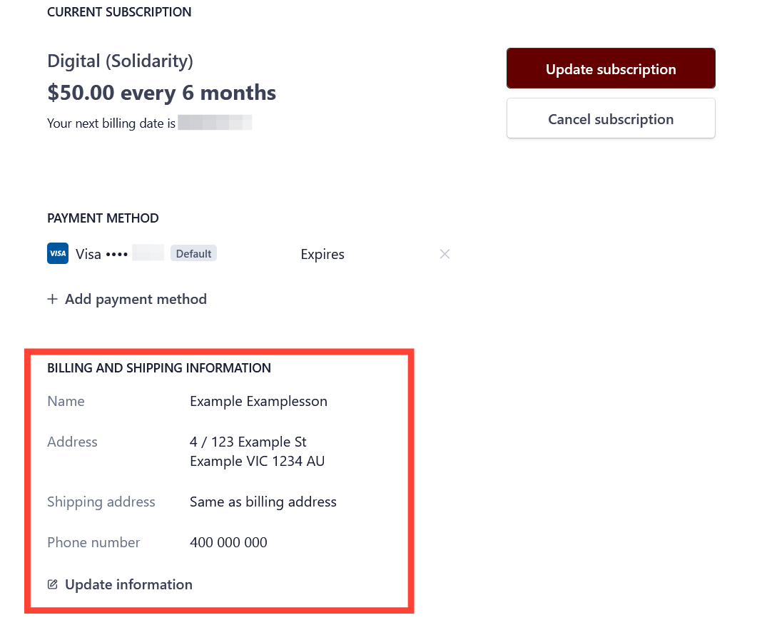 Login to the subscriber portal.Scroll down to the shipping and billing information section of the subscriber portal.Click update information.Update the address details and press save.
