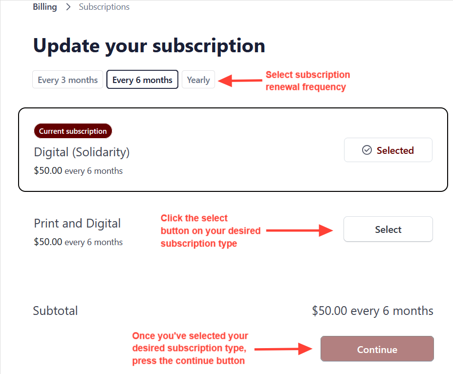 - Click the select button next to your preferred subscription type and press continue to go to the confirmation page.